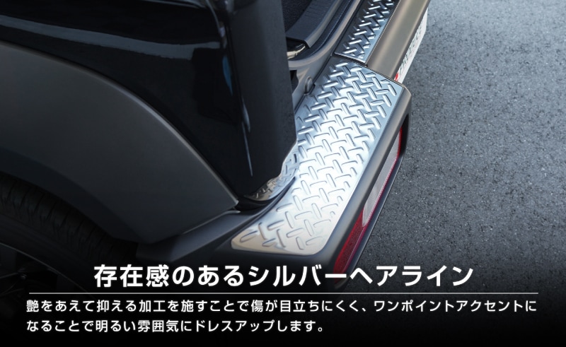 ジムニーシエラ・ジムニーノマドのリアバンパー上部に装着するドレスアップパーツです。