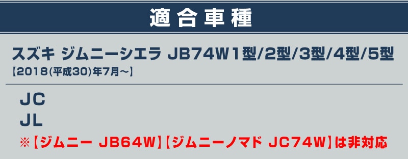 ■スズキ ジムニーシエラ JB74W 1型/2型/3型/4型/5型【2018(平成30)年7月~】 【対応グレード】 JC JL ※【ジムニー JB64W】【ジムニーノマド JC74W】は非対応 |
