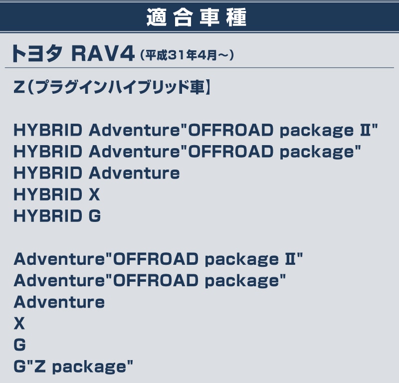 | ■トヨタ RAV4(平成31年4月~】 【対応グレード】 Z(プラグインハイブリッド車】 HYBRID Adventure"OFFROAD package Ⅱ" HYBRID Adventure"OFFROAD package" HYBRID Adventure HYBRID X HYBRID G Adventure"OFFROAD package Ⅱ" Adventure"OFFROAD package" Adventure X G G"Z package" |