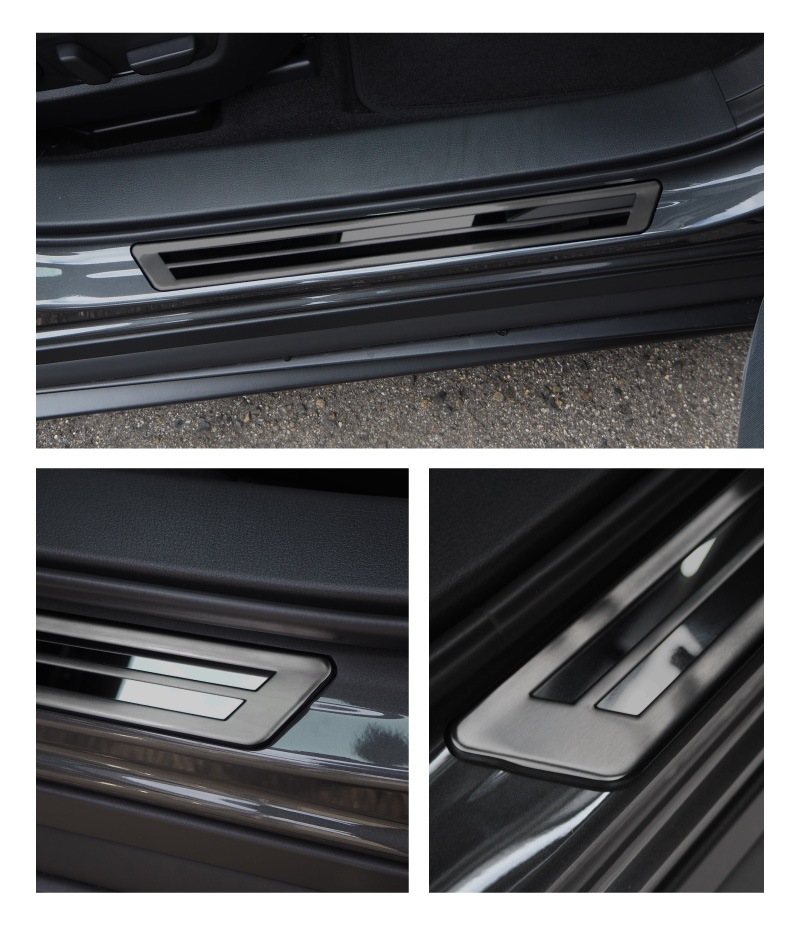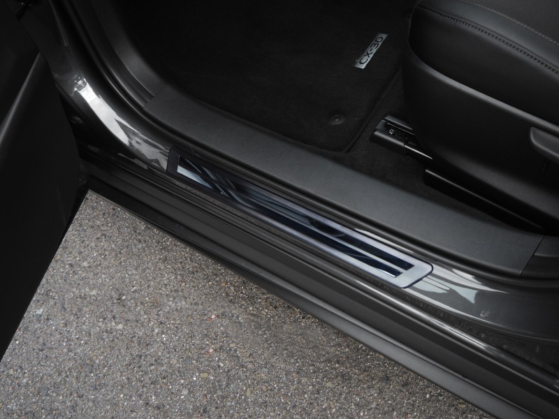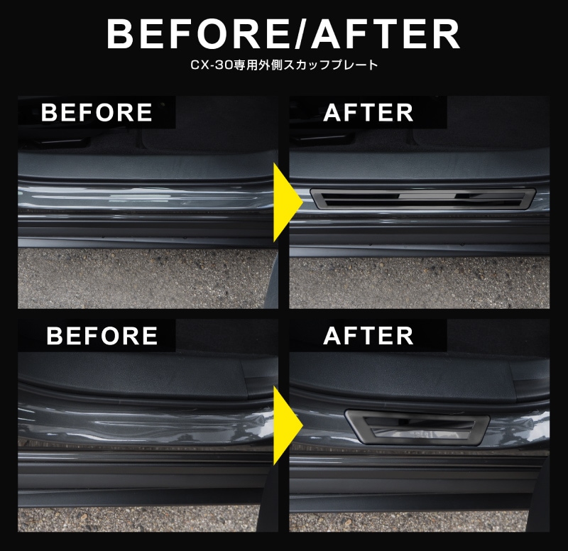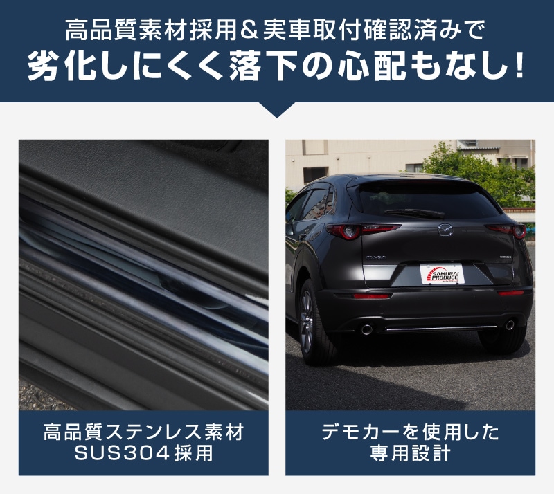 | CX-30のサイドステップ外側部分に装着する保護パーツです。 乗降時に踏みつけた際にキズや汚れが付きやすい部分をしっかりとガードします。 ■ブラックヘアライン×ブラック鏡面 落ち着いた中にも重厚感を感じるブラックで、さりげない高級感を演出します。 また、製品外周には保護ゴムを装着しており車体の接触による傷を抑えます。 デザインだけでなく安全性も考慮したサムライプロデュースクオリティを是非ご体験ください。 素材には高品質ステンレス素材SUS304を使用しておりますので、耐久性は抜群。 形状もサムライプロデュース保有のデモカーで実車確認を行っており、フィッティング抜群! お取り付けはあらかじめ裏面に装着済みの両面テープで貼り付けるだけで、簡単に装着できます。 |