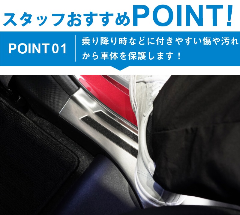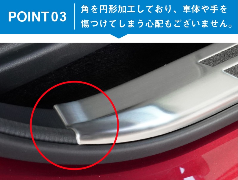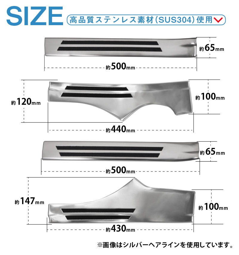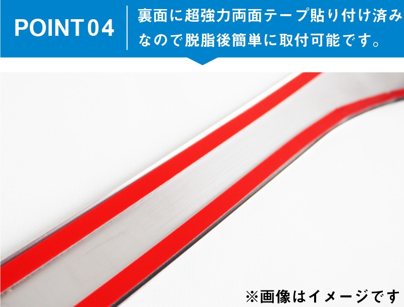 また、カラーもシルバー・ブラックの2カラーからお選びいただけるので、お好みのドレスアップがお楽しみいただけます。 製作時には実車からサイズを計測し、フィッティング確認を行っているので抜群の装着感を実現! ドアの開閉にも一切干渉しないので安心してお取り付け頂けます。 素材には高品質のステンレスSUS304を採用しているので耐久性も抜群。 お取り付けは裏側に装着済みの両面テープで貼り付けるだけで、簡単にお取り付け頂けます。 |