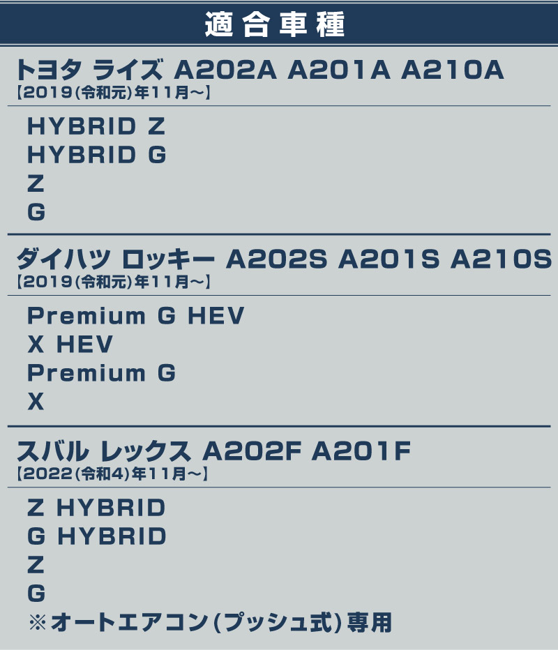 トヨタ ライズ・ダイハツ ロッキー・スバル レックス共通設計のエアコンスイッチパネルに装着するドレスアップパーツです。