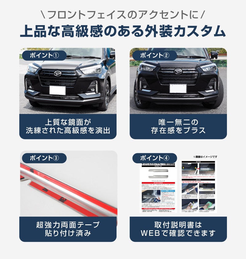 | トヨタ ライズ、スバル レックス共通設計のフロントマスクに装着するカスタムパーツ2点セットです。 お客様の多数のご要望にお応えして、ロッキー専用フロントパーツがついに登場! ロッキーのトレードマークである特徴的なフロントマスクにインパクトをプラス! 車体自体のデザインを生かした設計で、表面に美しい鏡面仕上げを施しておりしっかり個性を演出します。 素材は高品質ステンレスSUS304を採用、耐久性に優れているので純正パーツさながらのクオリティを実現。 製作は実車にてフィッティング確認を行いましたので、ライトの点灯には干渉する心配もありません。 お取り付けはあらかじめ商品裏面に装着済みの両面テープで貼るだけなので、簡単に装着していただけます。 |