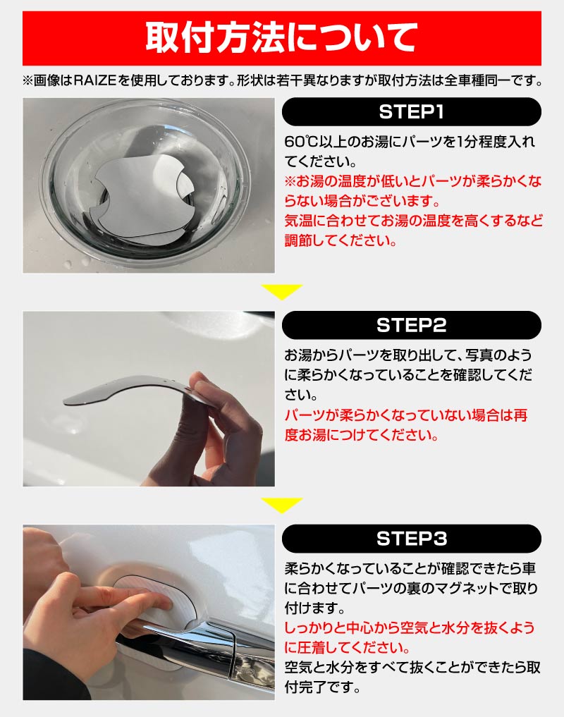 よくある粘着式ではなく当店オリジナルのマグネット装着タイプなのでお湯で柔らかくして貼り付けるだけで簡単!