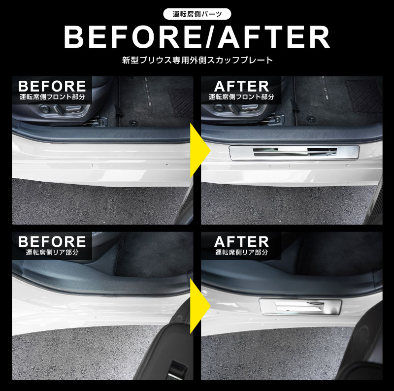 新型プリウス 60系 サイドステップ 外側スカッフプレート 4P 車体保護ゴム付き 選べる3カラー シルバーヘアライン ブラックヘアライン カーボン調|トヨタ TOYOTA PRIUS 60 MXWH60 ZVW60 専用 内装 保護 カスタム パーツ ドレスアップ アクセサリー 社外品