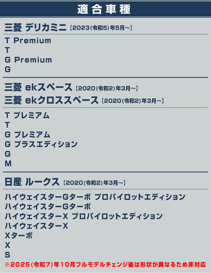 ※マイナーチェンジ・年次改良などにより形状に変更があった場合、適合車種に記載があってもお取り付けができない場合がございます。