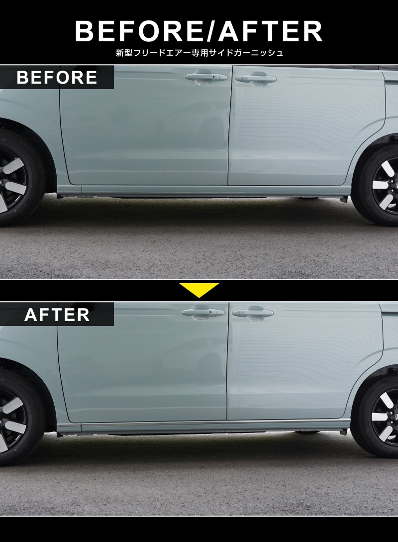 トップ > すべての商品 > 新型フリード GT系 エアー サイドガーニッシュ 6P 選べる2カラー サテンシルバー ブラック鏡面仕上げ|ホンダ HONDA FREED AIR 専用 外装 サイド メッキモール カスタム パーツ ドレスアップ アクセサリー 社外品 エアロ