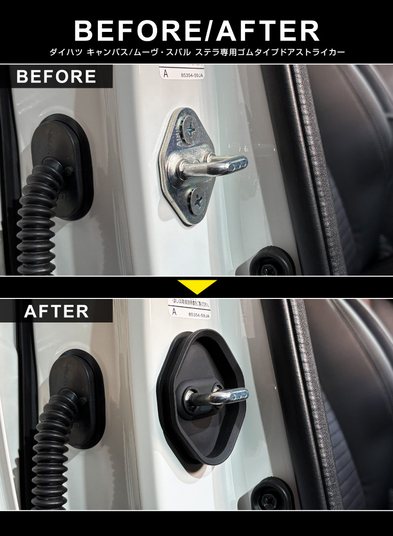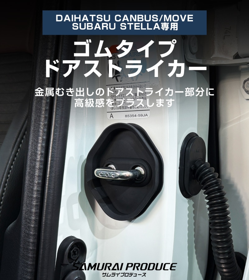ダイハツ 新型ムーヴ、ムーヴキャンバス、スバル ステラ共通設計のドアストライカー用ドレスアップパーツです。