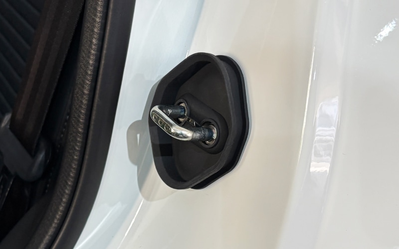 素材はゴム製で、ドアを閉める際の摩擦を軽減し、ドアロック部分を損傷から守ります。また、ドアを閉める音を和らげる効果もあります。