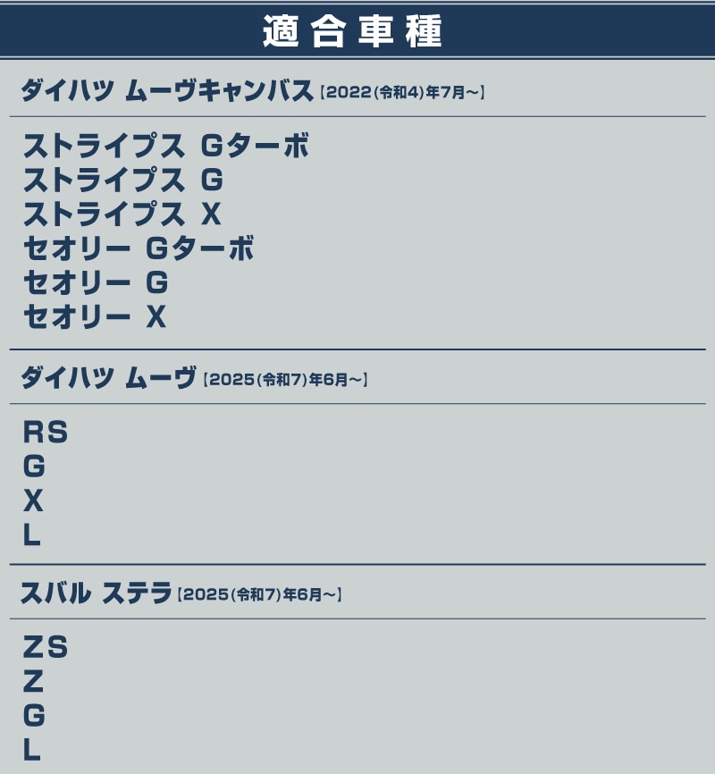 ※マイナーチェンジ・年次改良などにより形状に変更があった場合、適合車種に記載があってもお取り付けができない場合がございます。