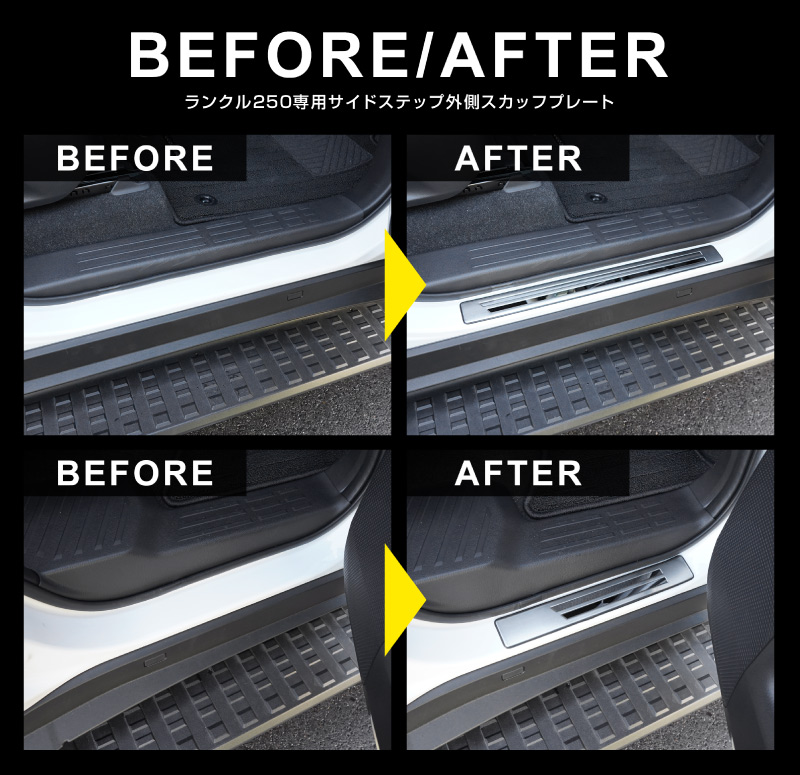 【セット割】新型ランドクルーザー ランクル250 サイドステップ内側&外側 スカッフプレート 保護パーツセット ブラックヘアライン|トヨタ ランクル TOYOTA LANDCRUISER 250系 専用 カスタム パーツ ドレスアップ アクセサリー オプション 内装 カー用品 社外 サイドシル 保護 傷防止 キズ隠し【予約販売/12月20日頃入荷予定】
