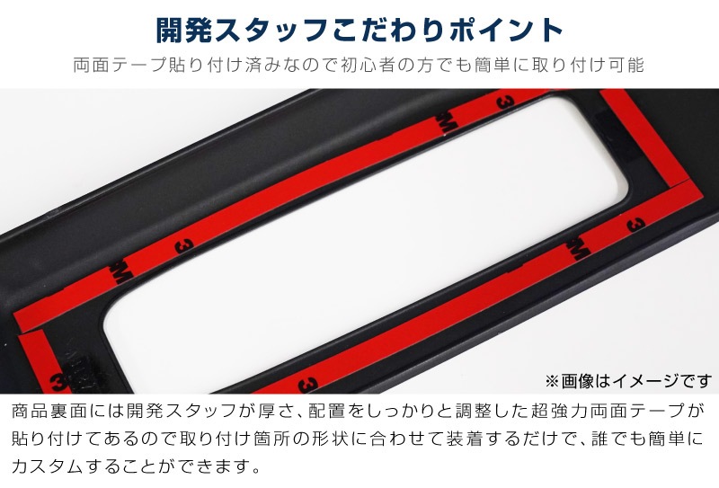 商品裏面に装着済みの、両面テープで取り付けるだけでどなたでも簡単に商品到着後すぐにカスタムいただけます。