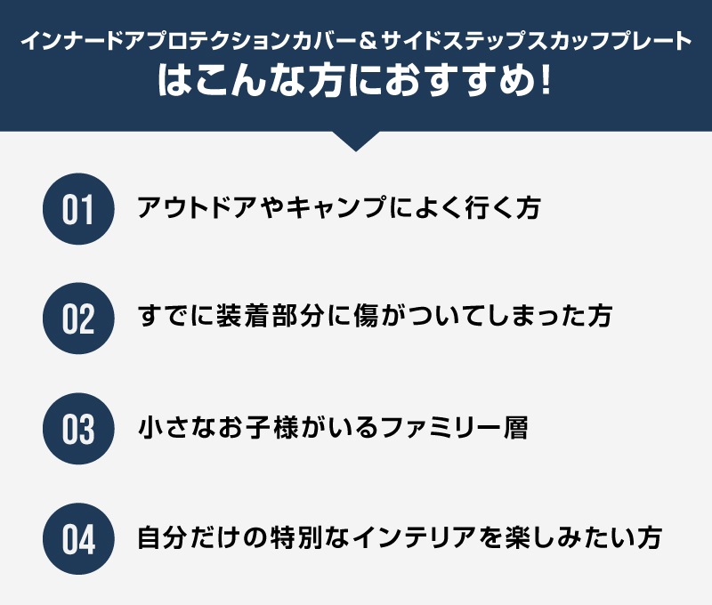 | ・サイドステップスカッフプレート 4P ・インナードアプロテクションカバー 4P |