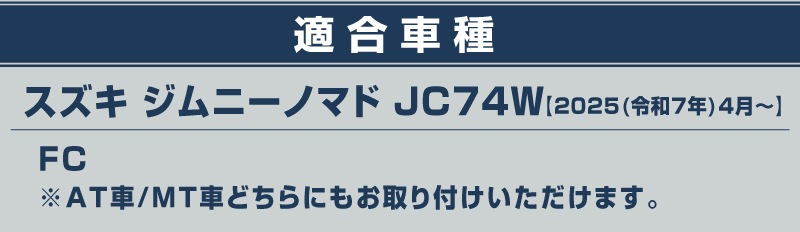 | ■スズキ ジムニーノマド JC74W【2025(令和7年)4月~】 【対応グレード】 FC ※AT車/MT車どちらにもお取り付けいただけます。 |