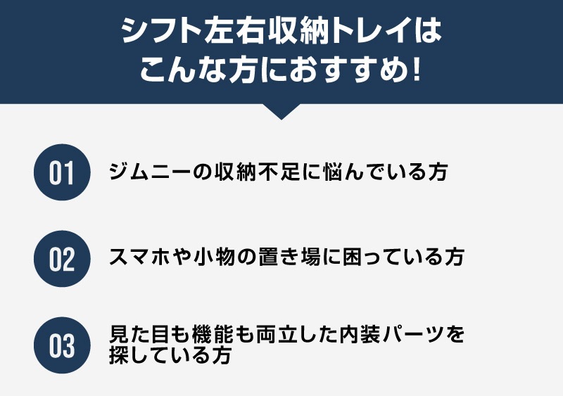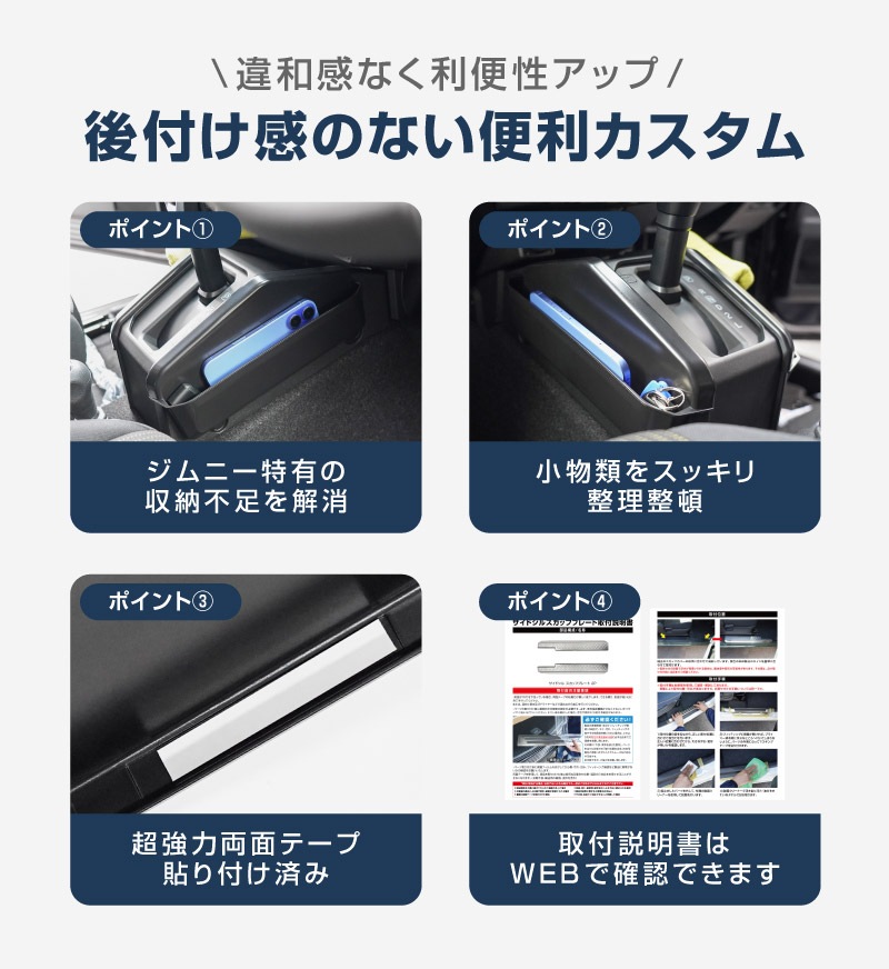 | ジムニー(AT車専用)のシフト左右に設置できる便利な収納トレイです。 運転席・助手席それぞれに1個ずつ設置でき、収納スペースが限られるジムニーに新たな小物収納をプラス。スマホや駐車券など、必要なアイテムを手の届く場所に置けて使いやすさ抜群です。 滑り止めマットを2枚付属し走行中でも小物をしっかりホールド。コンパクトながら高いグリップ力を発揮します。 取り付けはシフトレバー横にはめ込むだけ。裏面には両面テープも備えており使用すればさらに安定感がアップ。工具や知識は一切不要で、誰でもすぐに取り付けできます。 素材は耐衝撃性・耐熱性に優れた高品質ABS樹脂を採用。 デモカーでの装着確認済みで、フィット感も安心。 ジムニーの使い勝手をさらに高める専用アイテムです。 |