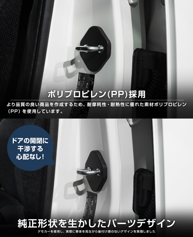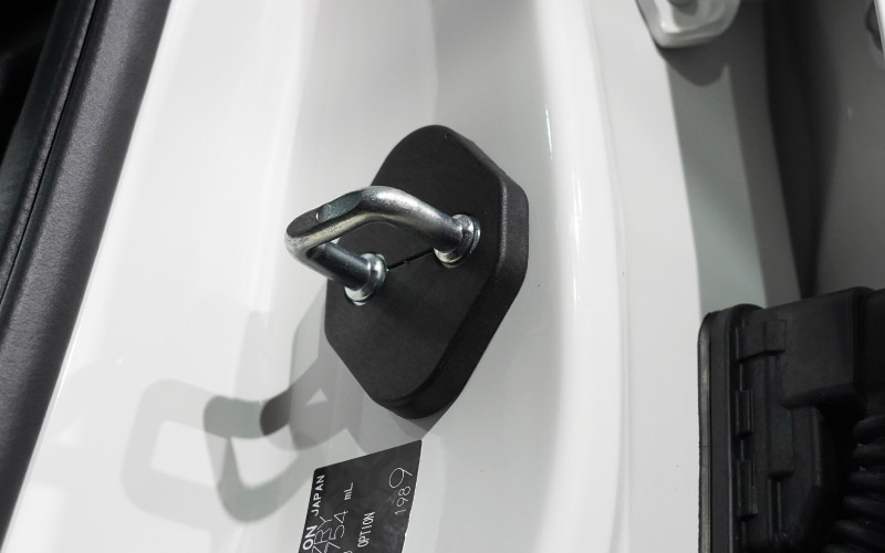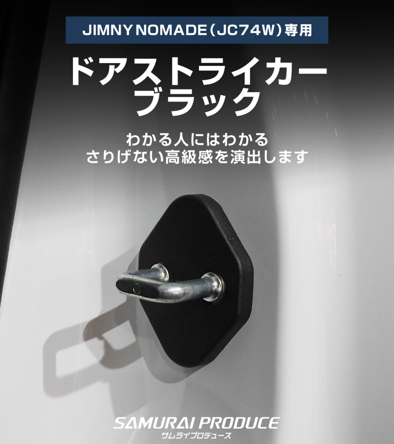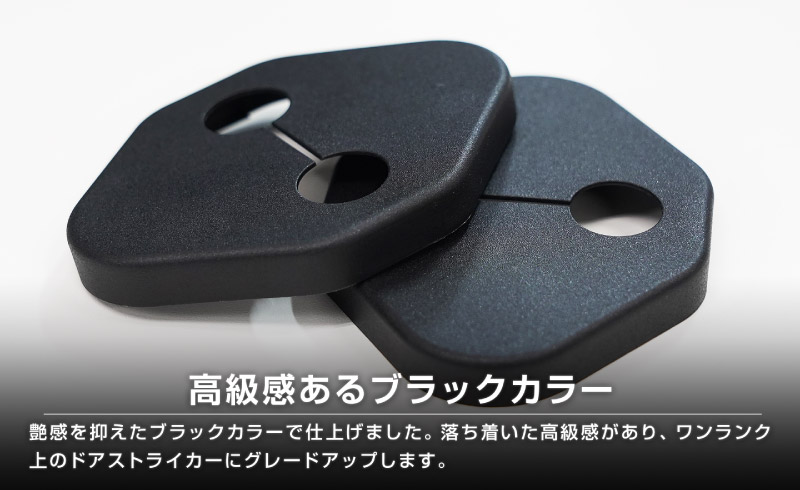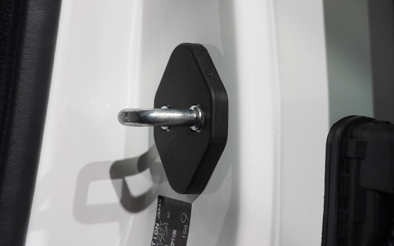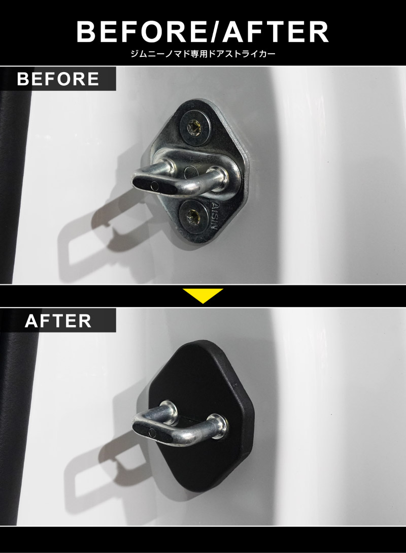| ジムニーノマド専用設計、ドアストライカーに装着するドレスアップパーツです。 無機質なドアストライカーのむき出し金具に装着することで、乗降時のアイキャッチとして車内に高級感をプラス!また、ドアストライカーのサビ、傷、腐食を防ぎ、保護パーツとしての役割も担い愛車を長くきれいに保てます。 カラーはブラックを採用。落ち着いた雰囲気に仕上げました。 製作時には実車からサイズを計測し、フィッティング確認を行っているので抜群の装着感!ドア開閉に全く支障はございません。 素材は軽量で傷がつきにくく、耐薬品性、耐摩耗性、耐衝撃性に優れたポリプロピレンを使用。 お取り付けはストライカーにはめ込むだけの簡単装着になります。 |