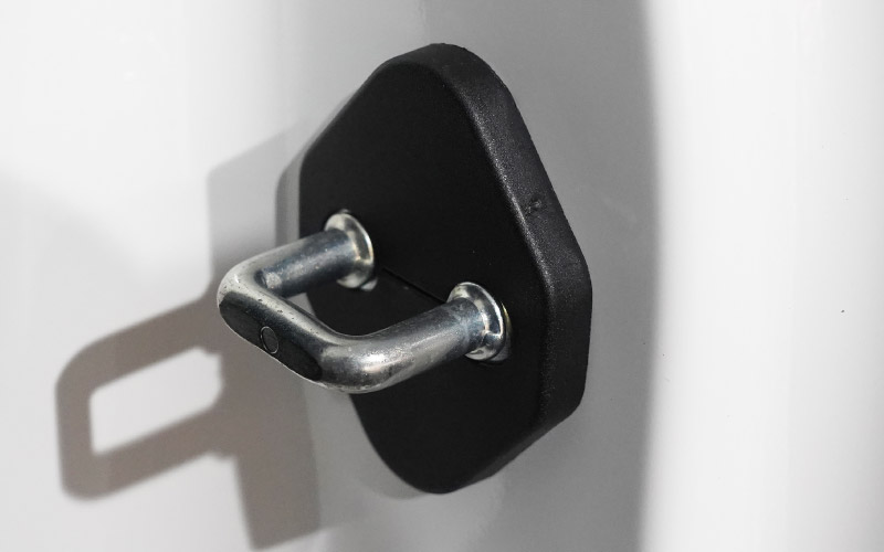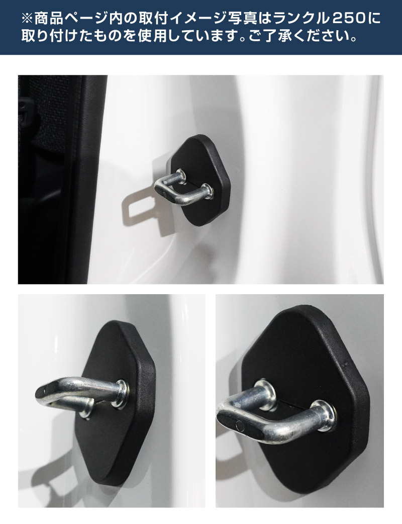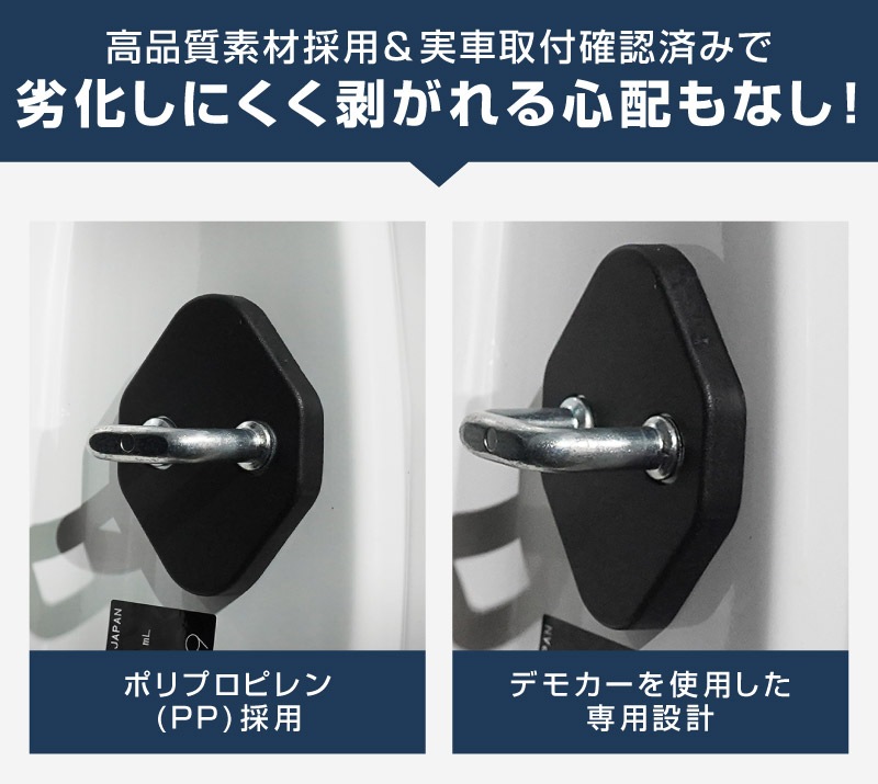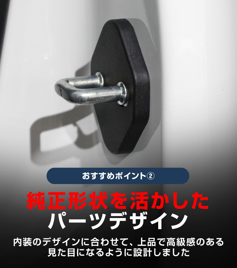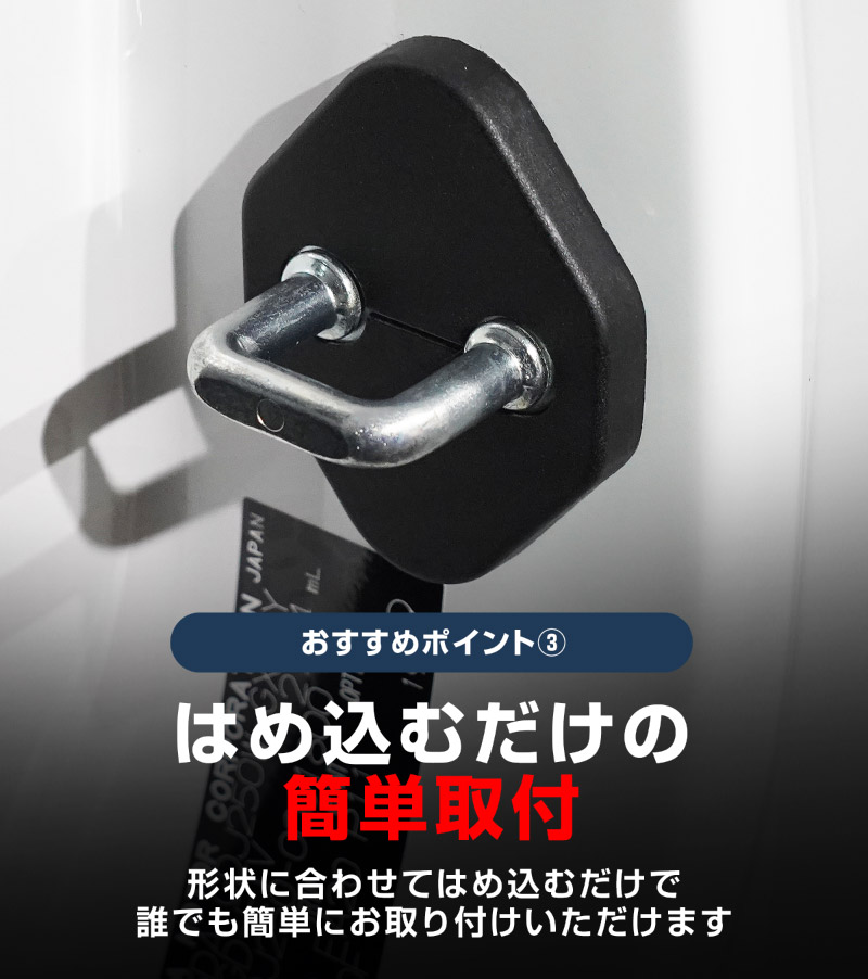 | ジムニーノマド専用設計、ドアストライカーに装着するドレスアップパーツです。 無機質なドアストライカーのむき出し金具に装着することで、乗降時のアイキャッチとして車内に高級感をプラス!また、ドアストライカーのサビ、傷、腐食を防ぎ、保護パーツとしての役割も担い愛車を長くきれいに保てます。 カラーはブラックを採用。落ち着いた雰囲気に仕上げました。 製作時には実車からサイズを計測し、フィッティング確認を行っているので抜群の装着感!ドア開閉に全く支障はございません。 素材は軽量で傷がつきにくく、耐薬品性、耐摩耗性、耐衝撃性に優れたポリプロピレンを使用。 お取り付けはストライカーにはめ込むだけの簡単装着になります。 |