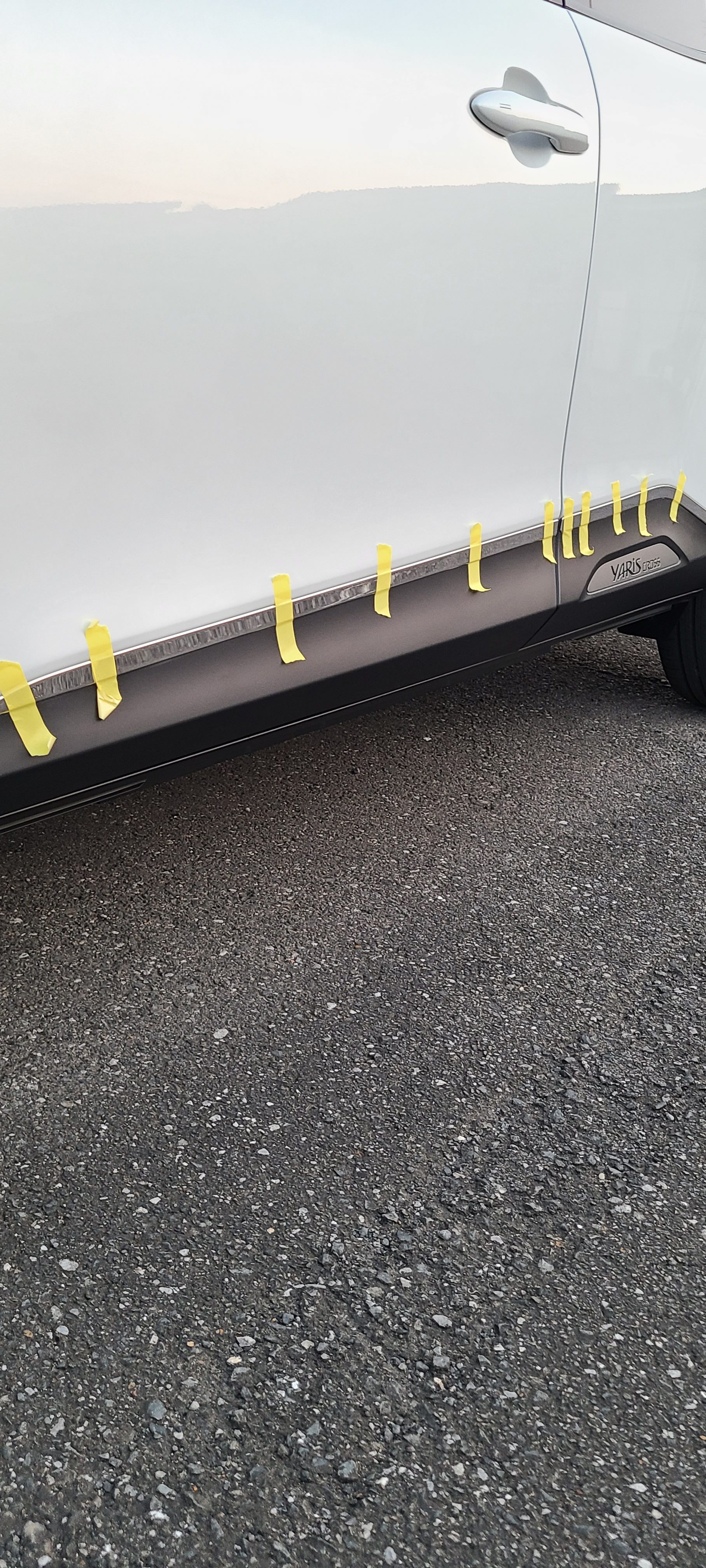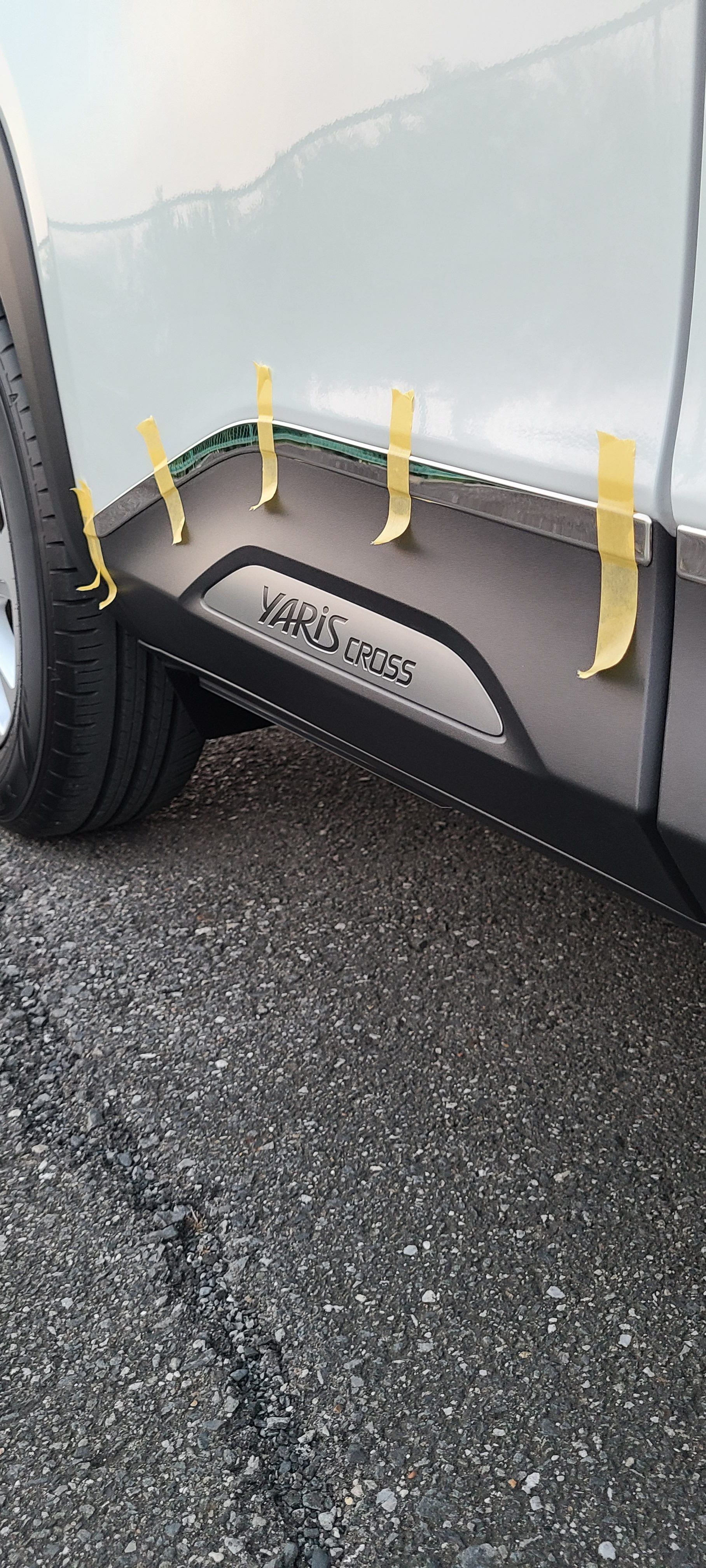 前回装着したフロントリップガーニッシュの質感 フィッティングが大変満足の商品で 続けて サイドガーニッシュを購入し 装着しました画像は 装着後 マスキングテープで 押さえ込みしてるところです