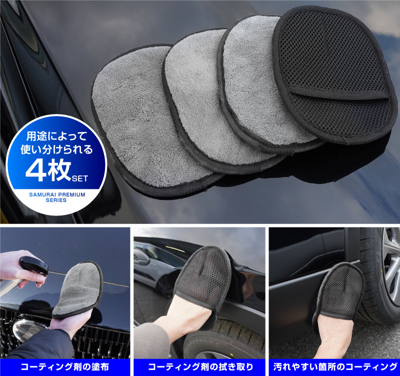 トップ > サプライ品 > 洗車・カーケア用品・カーメンテナンス > 【12/14〜10%OFF】サムライ マイクロファイバーミット Sサイズ グレー 4枚セット コーティング剤やワックスの拭き取りにおすすめ! 艶出し ツヤ出し WAX 拭き取り 拭き上げ 洗車 クリーナー【メール便対象/代引き・配達日時指定不可】