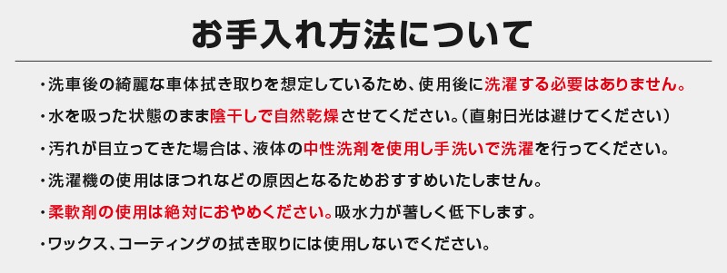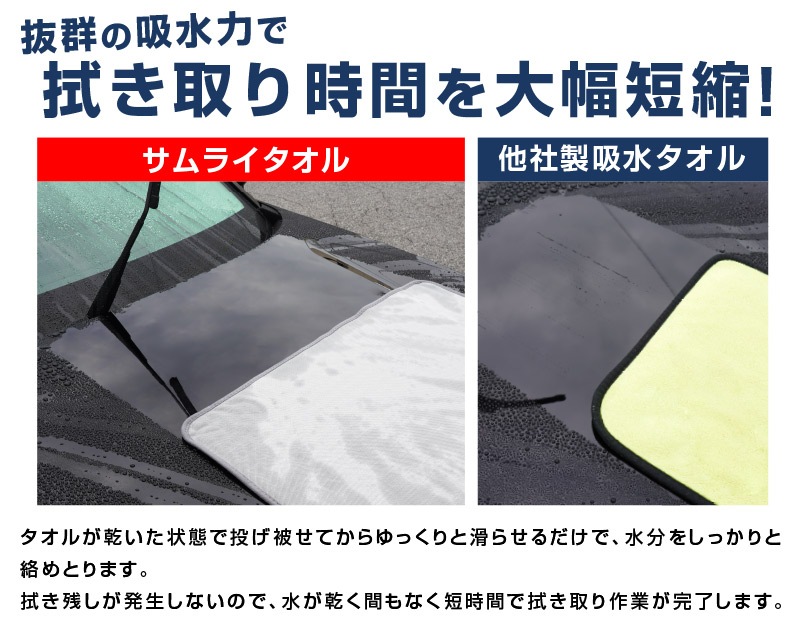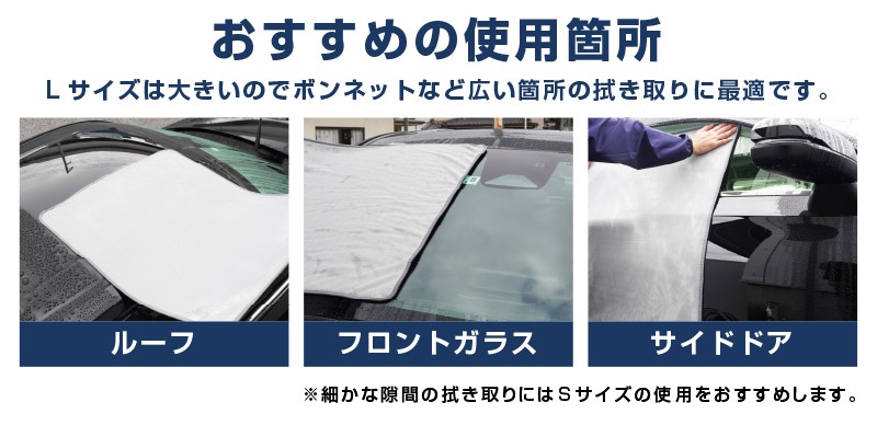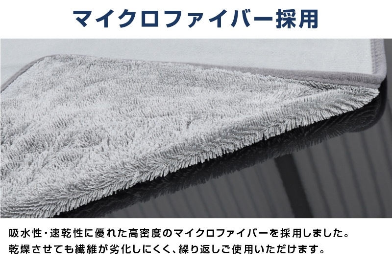 70cm×90cmの大きなマイクロファイバータオル1枚で絞ることなく車体全体のほとんどの水分を拭き上げる事ができます。
