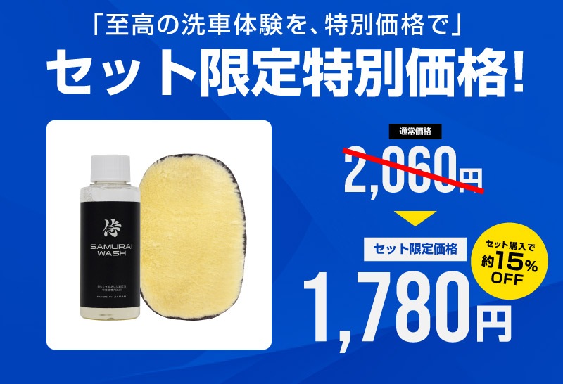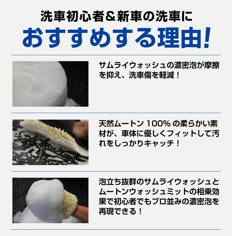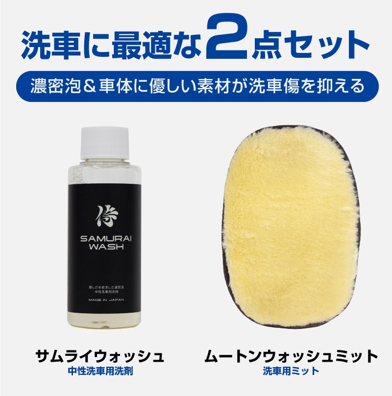 トップ > サプライ品 > 洗車・カーケア用品・カーメンテナンス > サムライプロデュースオリジナル > 【セット割】【サムライウォッシュお試しセット】サムライウォッシュ 濃密泡カーシャンプー 100ml 希釈タイプ & ウォッシュミット|希釈タイプ 中性 全車色対応 コーティング車OK ノーコンパウンド 新車・初めての洗車に最適 泡洗車 自動車用洗浄剤 洗車用