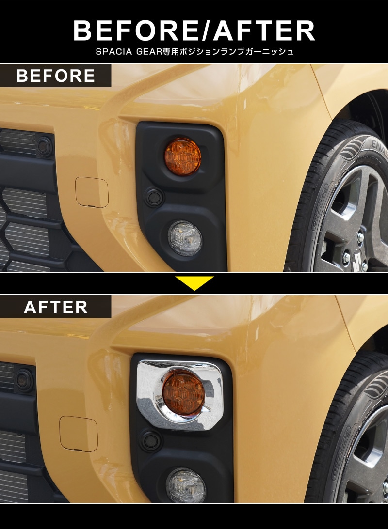 新型スペーシアギア専用のポジションランプ周りに装着するドレスアップパーツです。