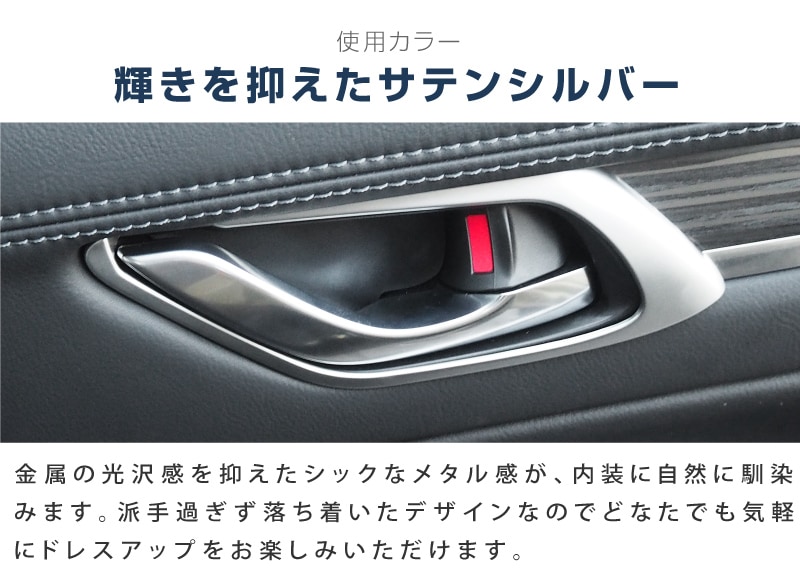 トップ > MAZDA マツダ > CX-5 > CX-5 KF系 前期/後期インナードアハンドル ガーニッシュ サテンシルバーメッキ 4P |マツダ MAZDA CX5 KF カスタム 専用 パーツ ドレスアップ アクセサリー 社外品 エアロ オプション
