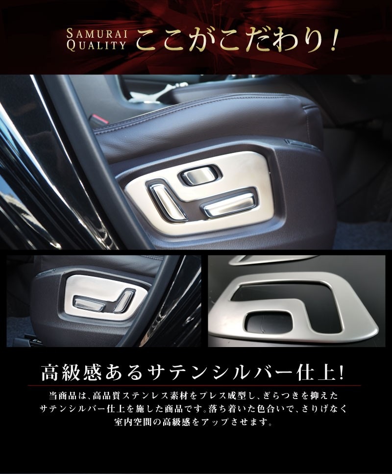 シートレバー周りの素地の部分をカバーし、サテンシルバーの色合いで、車内に高級感と落ち着きを与え、ワンランク上のドレスアップをお楽しみいただけます。