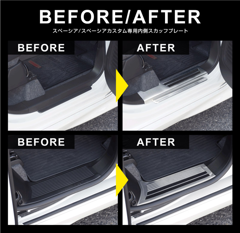 新型スペーシア スペーシアカスタム スペーシアギア MK54S MK94S MK53S スペーシアベース MK33V フレアワゴン MM53S MM54S MM94S サイドステップ スカッフプレート ブラック 滑り止め付き 4P|スズキ SUZUKI SPACIA SPACIA CUSTOM マツダ MAZDA FLAIR WAGON サイドシル カスタム 専用 内装 保護 パーツ ドレスアップ アクセサリー 社外品