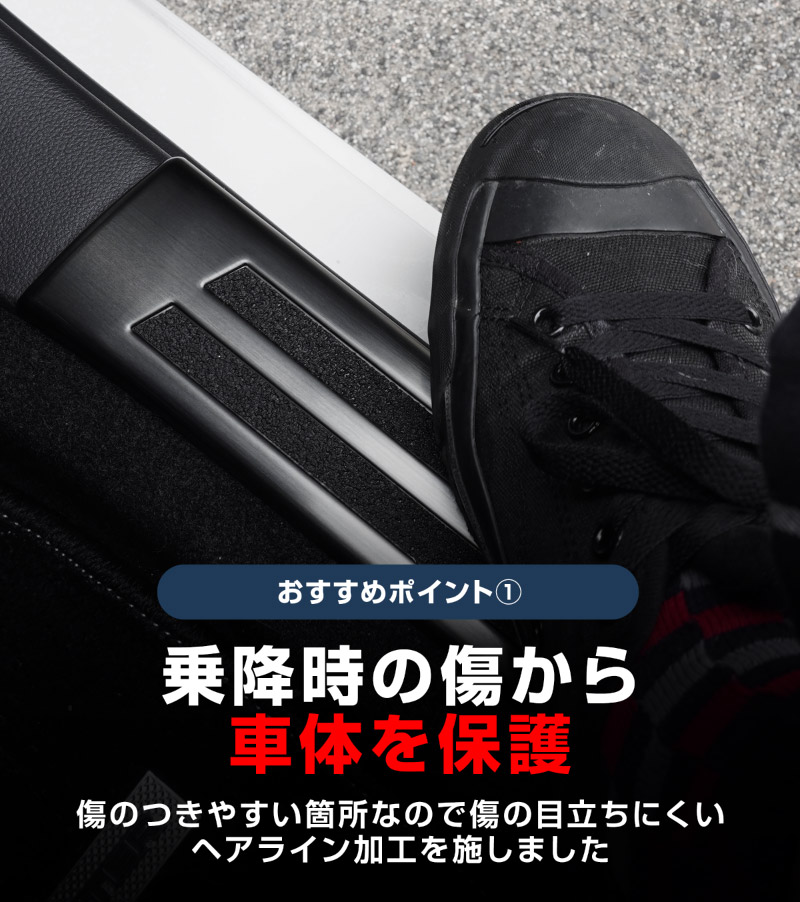 乗り降りで傷がつきやすいドアの足元部分をしっかりと保護し、大切な愛車を守ります。