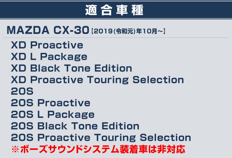 車体形状に沿って立体的に成型しており、CX-30内装の美しい曲面ラインを完璧に再現。内装に違和感のないワンポイントの高級感をプラスします。