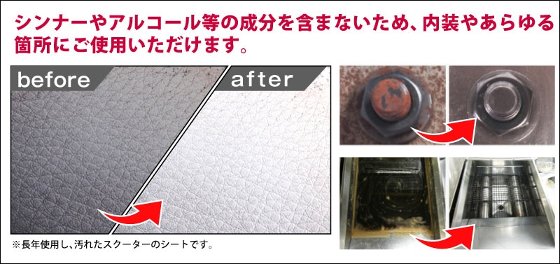 シンナーやアルコール等の成分を含まないため、カーペット、テーブル、プラスチック、金属、ゴムなどにも大手メーカーでも使用され、高い支持を受けている洗浄剤です。