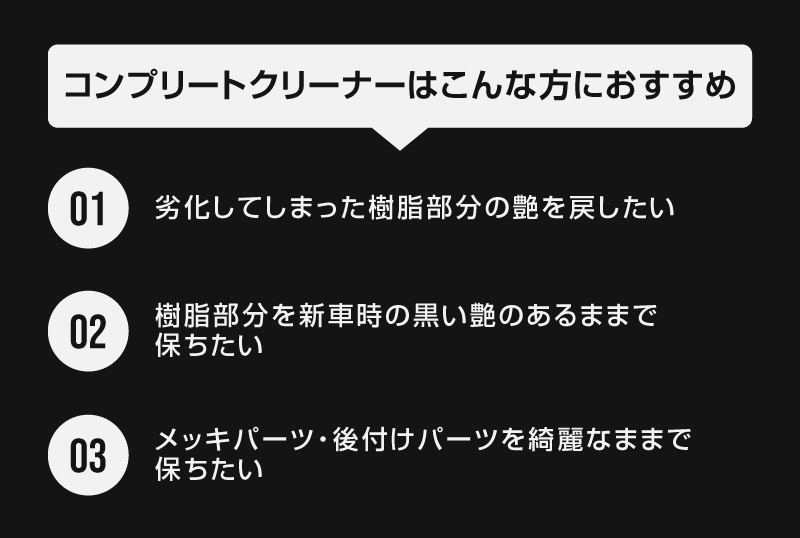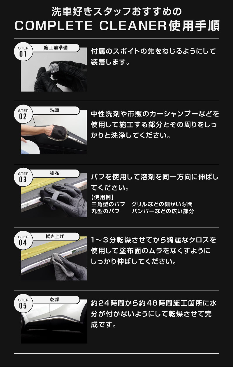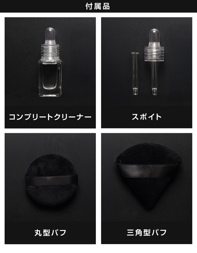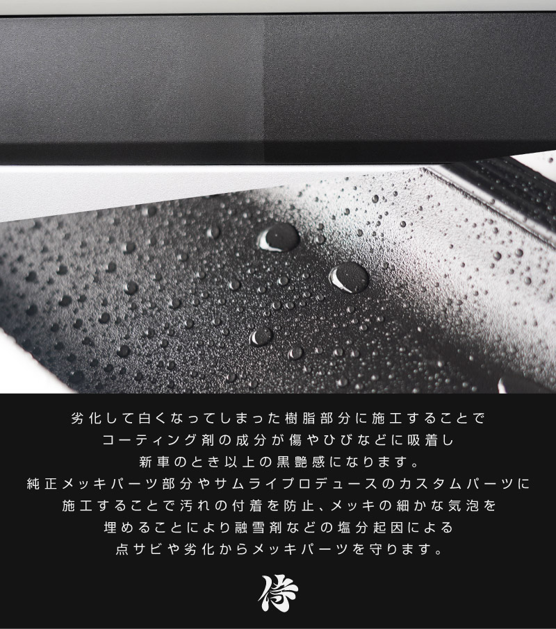 トップ > サプライ品 > 洗車・カーケア用品・カーメンテナンス > サムライプロデュースオリジナル > 樹脂コーティング剤 サムライコンプリートクリーナー 10ml スポイト/丸型パフ/三角パフ 付属 コーティング職人推奨 未塗装樹脂部分、メッキ部分のお手入れに 防汚効果 撥水効果 高耐久 保護