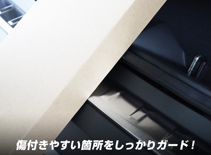 さらにリアバンパーガーニッシュは、荷物の積み下ろしなどで傷が付きやすい部分もしっかりとカバーし、車体の保護に役立ちます。 外側に折り返しが付いているので上面だけでなく特に塗装に傷が入りやすい角の部分もしっかりとガード! 製品外周には車体保護ゴムを装着しているのでステンレスパーツとの接触による傷の心配もありません。