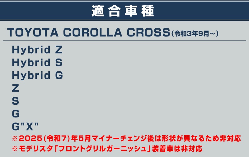 ■トヨタ カローラクロス 3BA-ZSG10 6AA-ZVG15 6AA-ZVG11 4BA-MXGA10 6AA-ZVG13 6AA-ZVG16【2021(令和3)年9月〜2025(令和7)年4月】