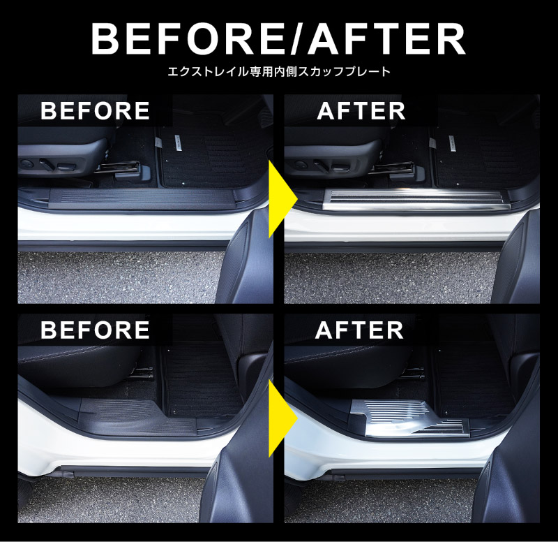 トップ > NISSAN 日産 > X-TRAIL T33型(令和4年7月〜)エクストレイル > 内装パーツ エクストレイル(X-TRAIL T33) > 新型エクストレイル T33 サイドステップ 内側スカッフプレート フロント・リアセット 4P 滑り止めゴム付き 選べる3カラー シルバー/ブラック/カーボン調 2025年マイナーチェンジ後対応|日産 NISSAN X-TRAIL 専用 内装 保護 カスタム パーツ ドレスアップ アクセサリー 社外品【予約販売/ブラック:2月20日頃入荷予定】