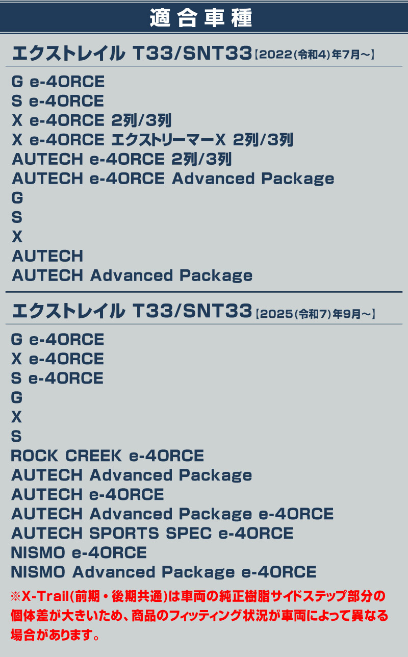 ※X-Trail(前期・後期共通)は車両の純正樹脂サイドステップ部分に個体差が大きいため、商品のフィッティング状況が車両によって異なる場合があります。 |