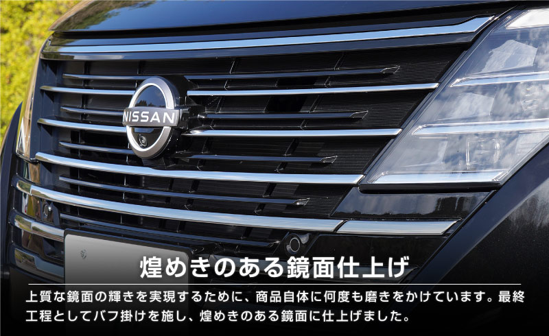 新型セレナ C28 ハイウェイスター/e-POWER 専用 フロントグリルガーニッシュ 8P 鏡面仕上げ|ニッサン NISSAN SERENA C28型 専用 外装 カスタム パーツ ドレスアップ アクセサリー 社外品 エアロ