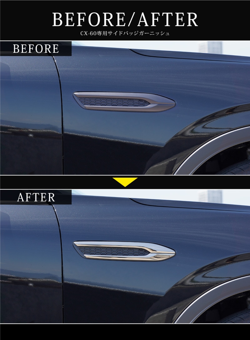トップ > MAZDA マツダ > CX-60 > 外装パーツ CX60 KH系 > CX-60 KH系 ガソリン ディーゼル 専用 サイドバッジガーニッシュ 4P 選べる3色 鏡面仕上げ/スモークシルバー/ブラック鏡面仕上げ|マツダ MAZDA CX60 専用 外装 サイド シグネチャー カスタム パーツ ドレスアップ アクセサリー 社外品 エアロ