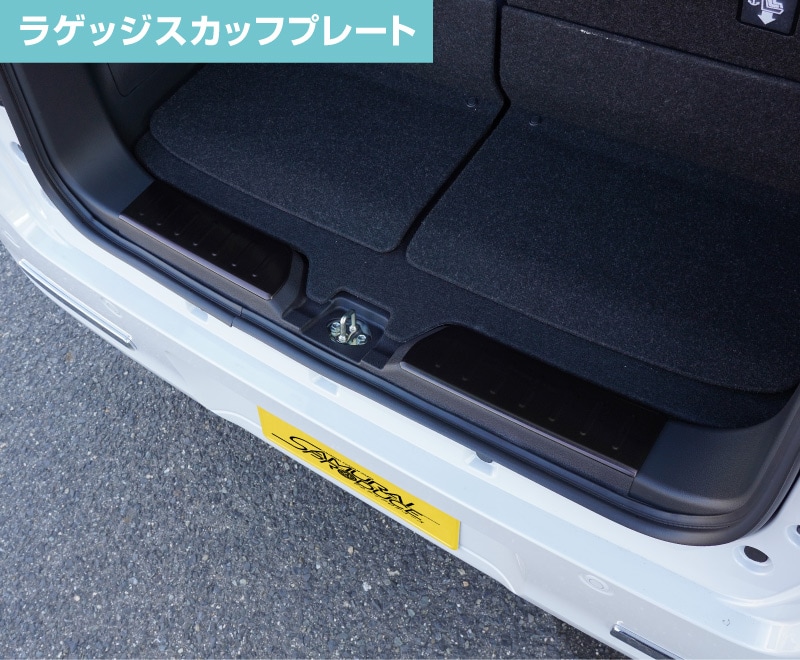 新型ムーヴキャンバス専用のトランク内部ラゲッジエンドの樹脂部分、サイドステップ乗降口に装着する保護パーツセットです。