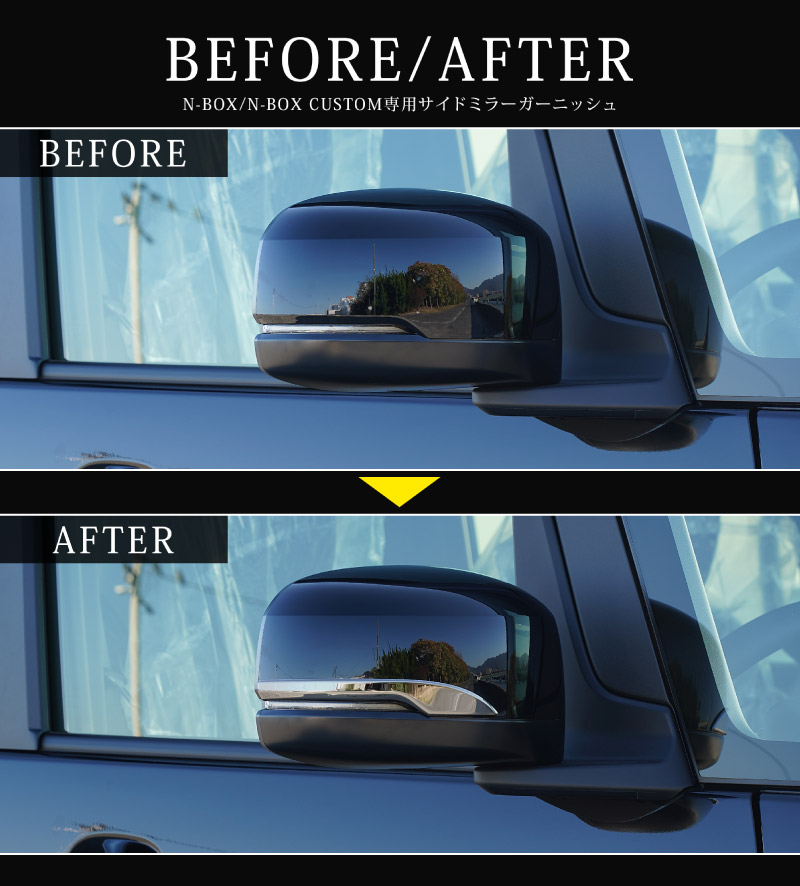 新型N-BOX N-BOX JOY 対応/N-BOXカスタム JF3 JF4 JF5 JF6 サイドミラーガーニッシュ 鏡面仕上げ 2P|ホンダ HONDA NBOX NBOX CUSTOM エヌボックス ジョイ カスタム 専用 パーツ ドレスアップ アクセサリー 社外品 エアロ オプション