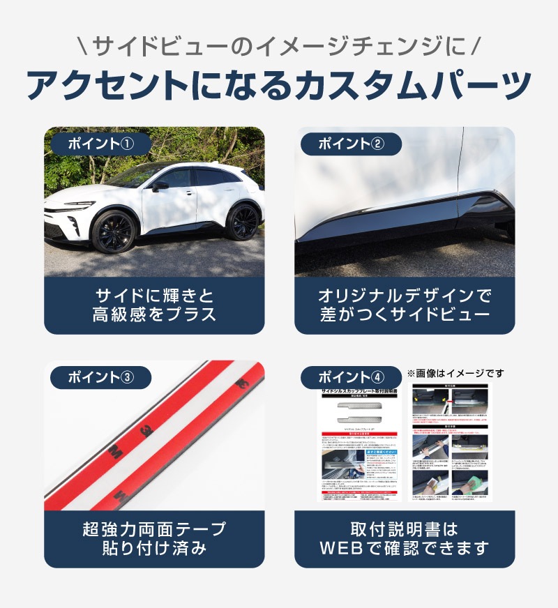 トップ > TOYOTA トヨタ > クラウン スポーツ/クロスオーバー(CROWN SPORT/CROSSOVER) > 外装パーツ クラウン スポーツ/クロスオーバー(CROWN SPORT/CROSSOVER) > クラウンスポーツ サイドガーニッシュ 4P 鏡面仕上げ|TOYOTA トヨタ CROWN SPORT AZSH36W AZSH37W PHEV 専用 外装 サイド カスタム パーツ ドレスアップ オプション アクセサリー 社外品