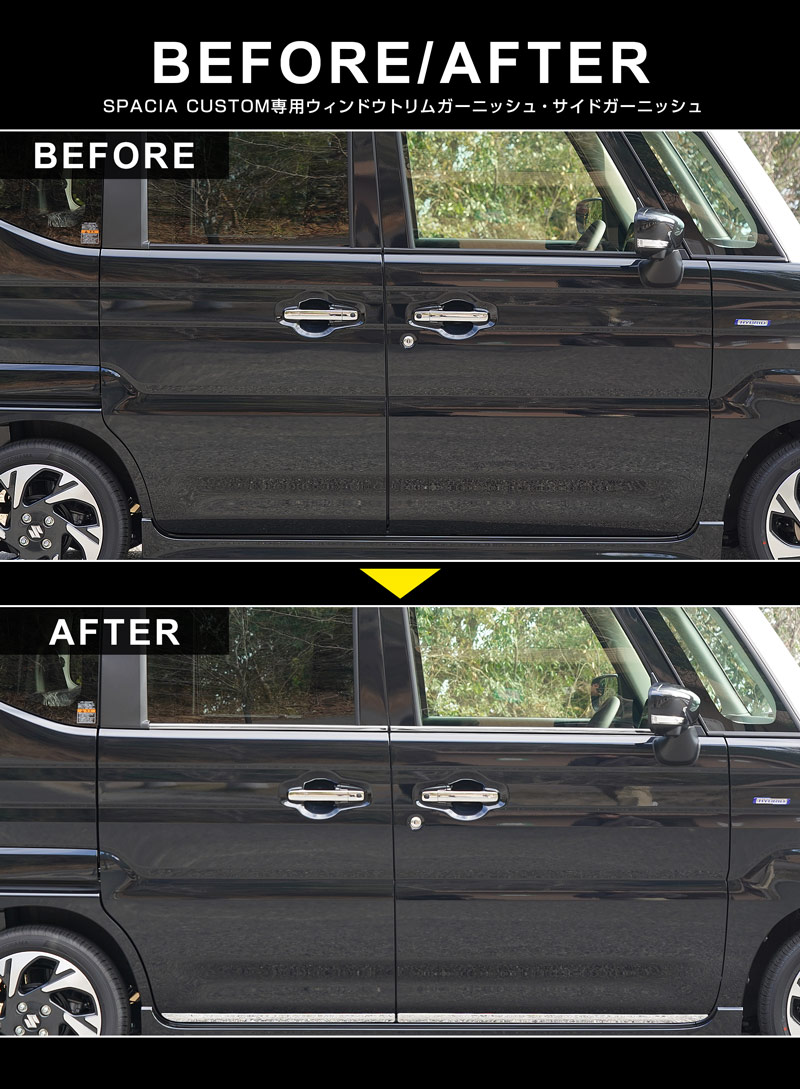 トップ > SUZUKI スズキ > スペーシア/スペーシアカスタム(令和5年11月〜)SPACIA MK54S/MK94S > 外装パーツ スペーシア/スペーシアカスタム(令和5年11月〜)SPACIA MK54S/MK94S > 【セット割】新型スペーシア スペーシアカスタム スペーシアギア MK54S MK94S フレアワゴン MM54S MM94S ウィンドウトリム&サイドガーニッシュ 外装パーツセット 鏡面仕上げ|SUZUKI スズキ SPACIA CUSTOM GEAR マツダ MAZDA FLAIR WAGON 専用 外装 サイド カスタム パーツ ドレスアップ アクセサリー 社外品 エアロ【予約販売/2026年1月20日頃入荷予定】