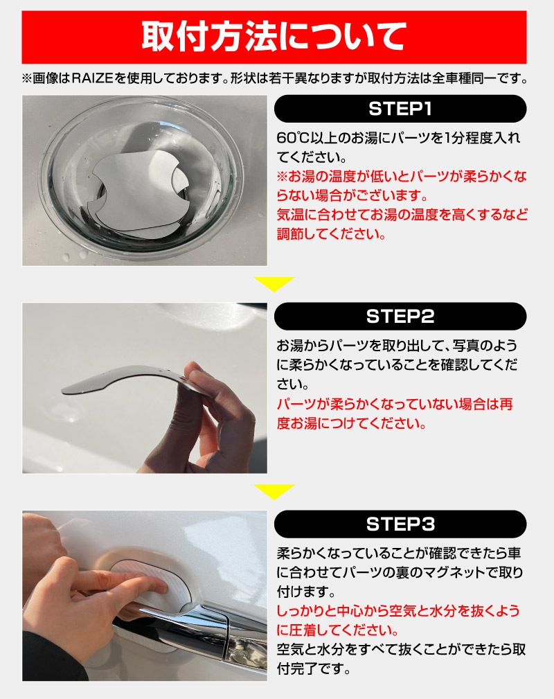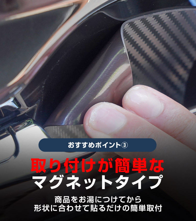 よくある粘着式ではなく当店オリジナルのマグネット装着タイプなのでお湯で柔らかくして貼り付けるだけで簡単!