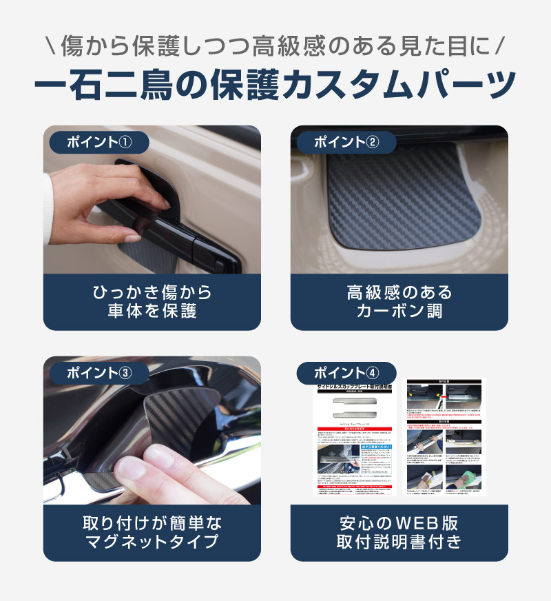 スペーシア カスタム ギア ハスラー フレアワゴン N-BOX N-BOX JOY 対応 タント ムーヴキャンバス ムーブ デリカミニ ekスペース ルークス共通 マグネット装着タイプ ドアハンドルプロテクター フロント・リアセット 4P カーボン柄 選べる2カラー ブラック ホワイト|SPACIA CUSTOM GEAR HUSTLER FLAIR WAGON NBOX TANTO MOVE 【メール便対象/代引き・配達日時指定不可】