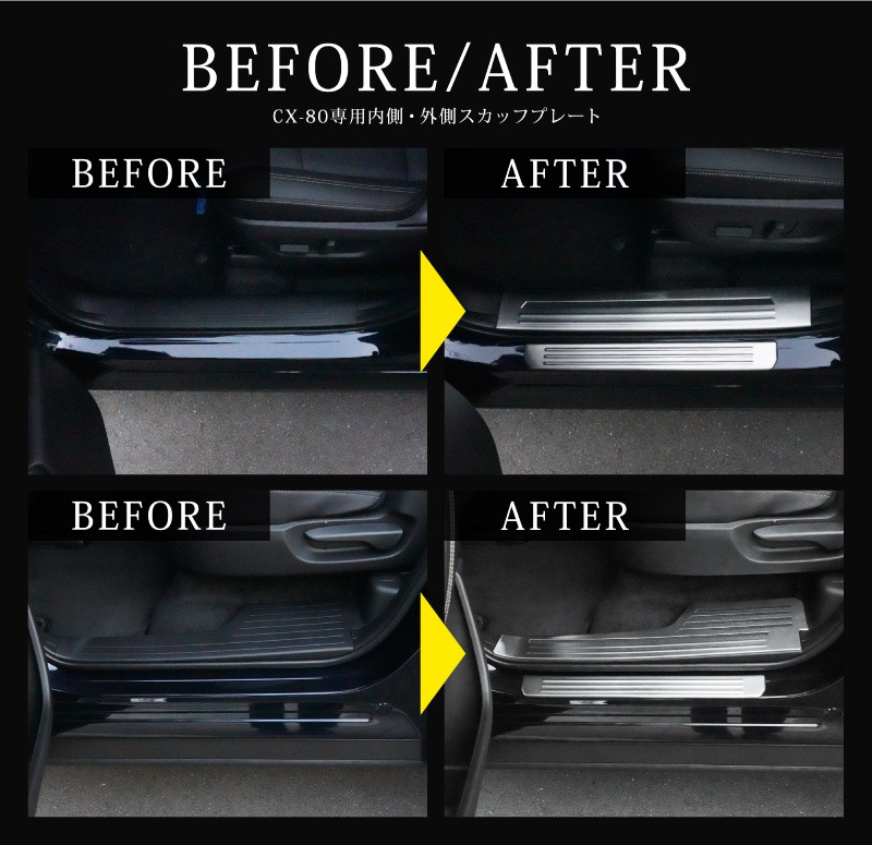 【セット割】CX-80 KL系 スカッフプレート サイドステップ内側&外側フロント・リア 保護パーツセット ブラックヘアライン|マツダ MAZDA CX80 専用 内装 カスタム パーツ ドレスアップ アクセサリー オプション 内装 社外 保護 傷防止 キズ隠し