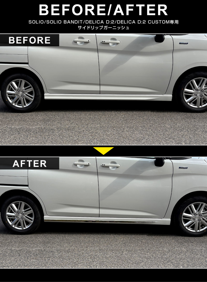 新型ソリオ ソリオバンディット デリカD:2 デリカD:2カスタム サイドガーニッシュ 鏡面仕上げ 4P|スズキ SUZUKI SOLIO BANDIT MAD7S 5AA-MA37S 5BA-MA27S MA27S MA37S 三菱 MITSUBISHI DELICA D2 CUSTOM 専用 外装 カスタム パーツ ドレスアップ アクセサリー 社外品 エアロ オプション