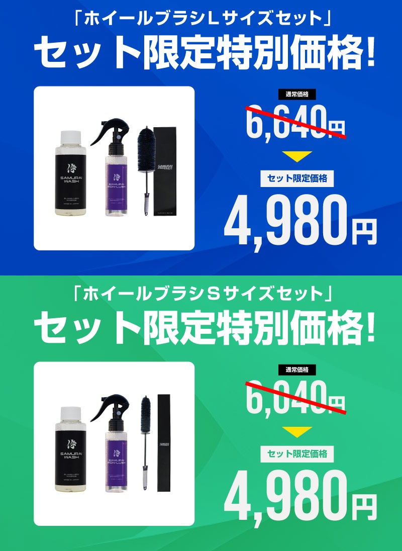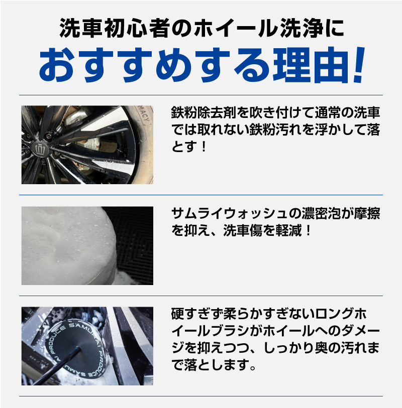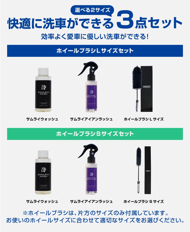 トップ > サプライ品 > 洗車・カーケア用品・カーメンテナンス > サムライプロデュースオリジナル > 【セット割】【ホイール洗車セット】サムライアイアンラッシュ 鉄粉クリーナー 100ml & サムライウォッシュ 濃密泡カーシャンプー 100ml &サムライホイールブラシ 選べる2サイズ Sサイズ Lサイズ 洗車 鉄粉除去剤 泡洗車 クリーナー サビ取り リムーバー メンテナンス