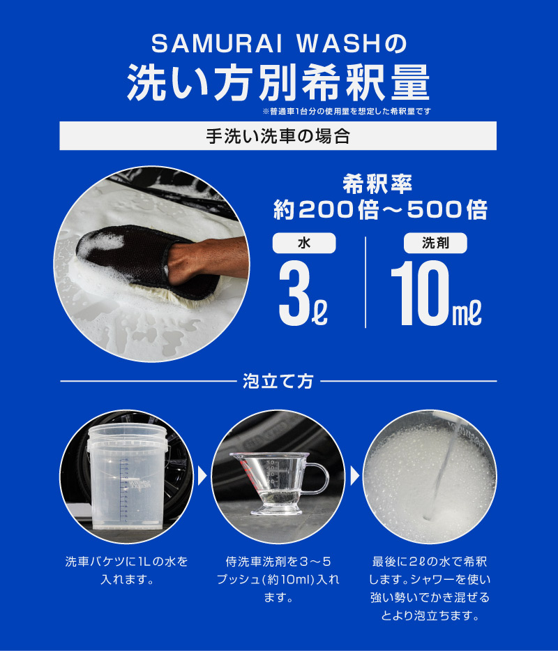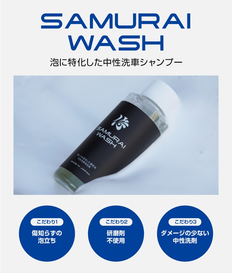 サムライウォッシュ 濃密泡カーシャンプー 100ml|希釈タイプ 中性 全車色対応 コーティング車OK ノーコンパウンド 新車・初めての洗車に最適 泡洗車 自動車用洗浄剤 洗車用