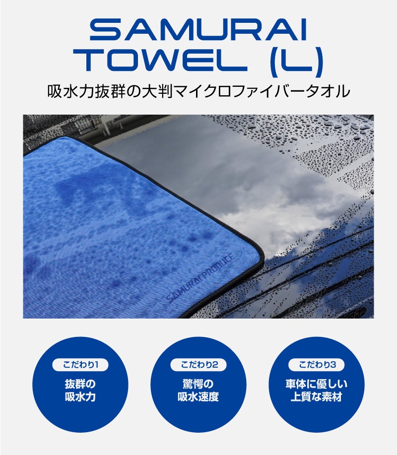超吸水 サムライタオル Lサイズ 70cm×90cm マイクロファイバータオル サムライプロデュースオリジナル 洗車タオル 抜群の吸水性で車体の上を滑らせるだけで簡単拭き上げ